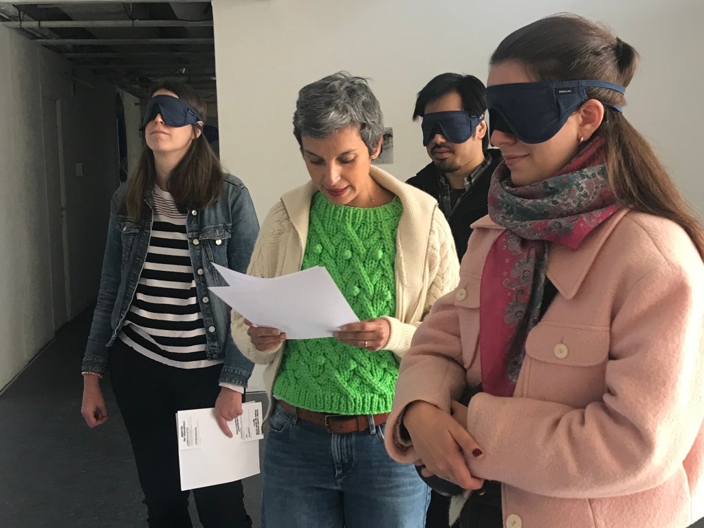 In this first experiment, the explorer-visitors don’t need a virtual reality headset. They simply close their eyes, use their imagination, and teleport as a group with their guide on a 10-minute journey. Movement and group interaction within the virtual spaces occur naturally.