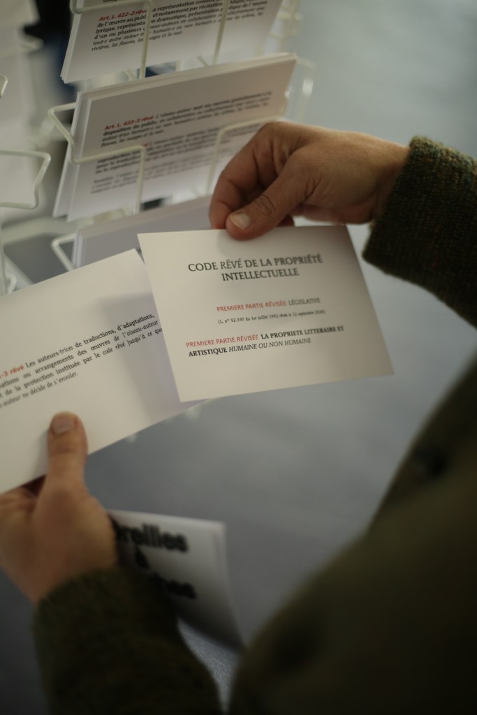 Ten postcards as acts of poetic resistance. They imagine a “copyright for birds” within a fictional intellectual property code. In this new legal framework, the bird becomes the author of its creations and offers them to us — unless it decides to fly away… The postcards are available to anyone who may take them, keep them, leave them elsewhere, or send them by mail. They might be the beginning of a rumor, spreading like a bird announcing a dreamed, living, and inclusive revision of our world.